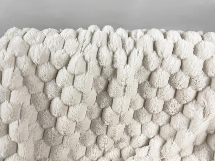 This material is gorgeous and extremely soft to the touch. There is such a unique level of depth and texture to the jacuard faux rabbit fur. There are many different patterns available, some more abstract and natural, some more geometric and symmetrical. Coloration can be solid, multitonal or tie-dye. Recycled options available.