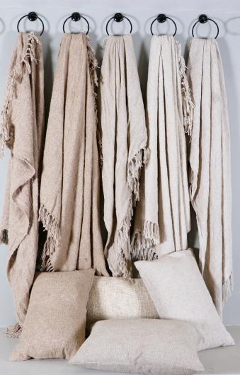 Linen throws and pillows are crafted from natural linen fabric, known for its soft texture, breathability, and timeless elegance. They add a relaxed, sophisticated touch to any space while providing comfort and versatility. Perfect for layering on sofas, beds, or chairs, linen throws and pillows enhance interiors with effortless style and natural charm.